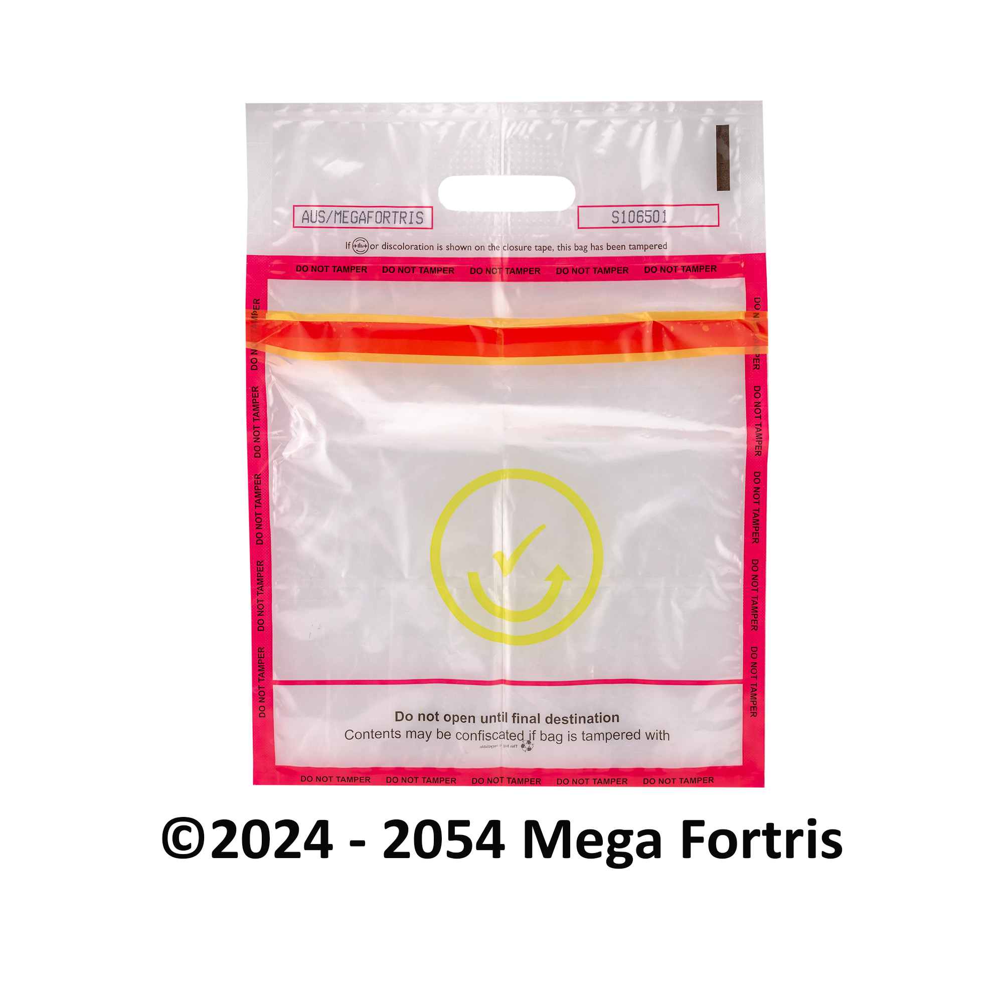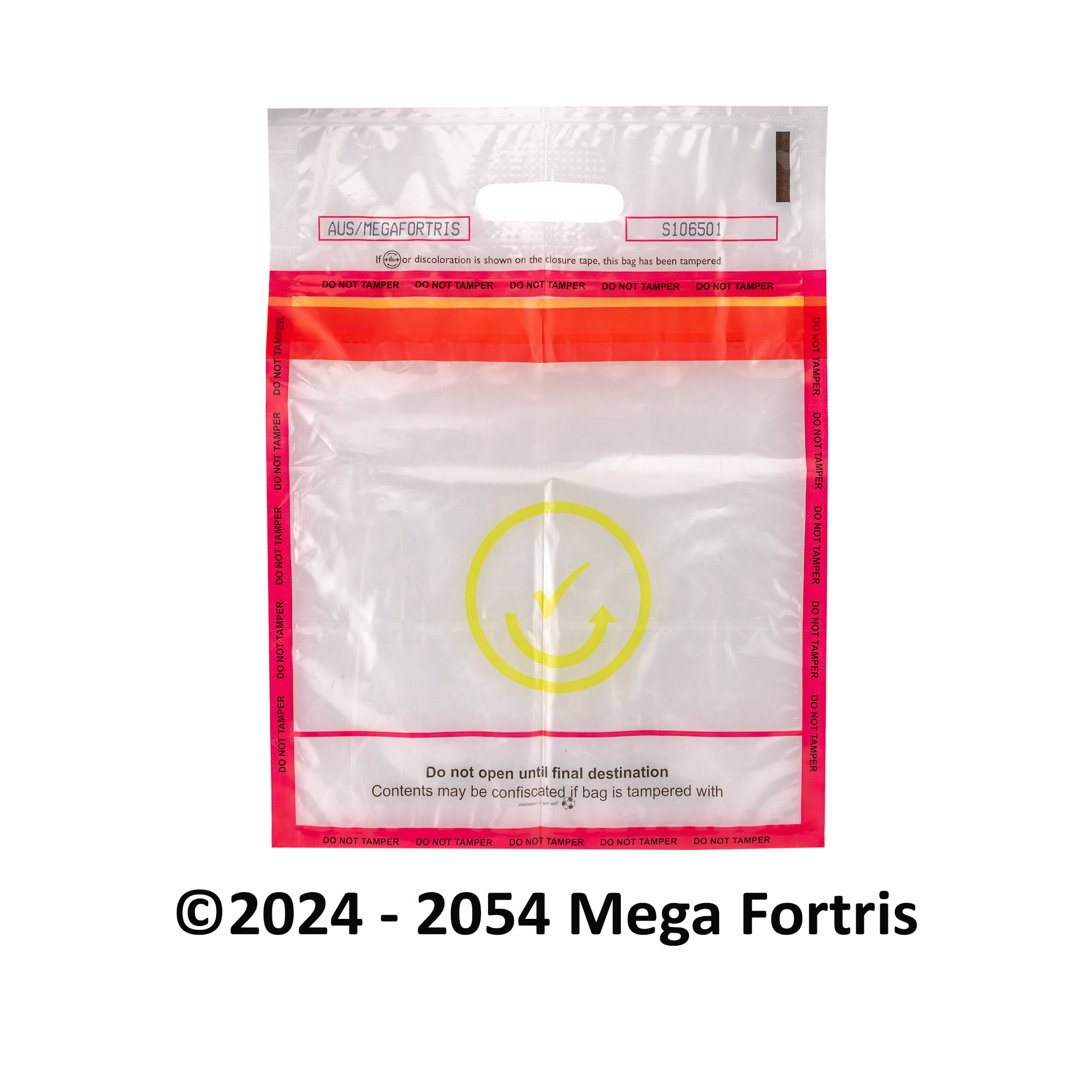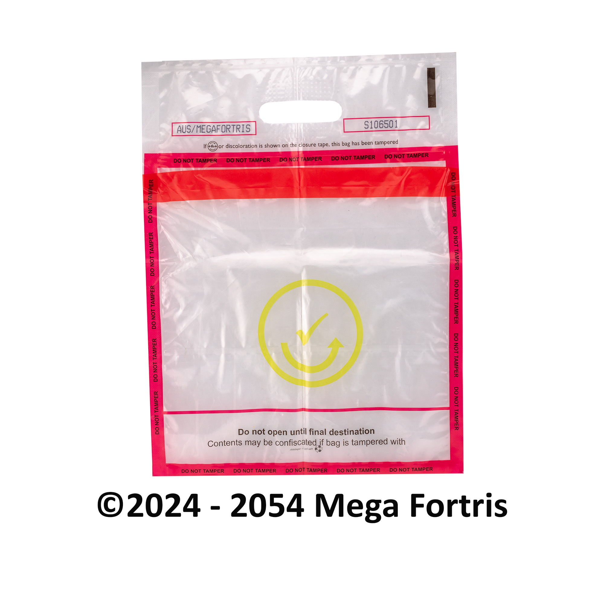Tamper-evident bags in Mega Fortris are available in a wide range of selection for different requirements. The user-friendly bags are made of recyclable plastic material and are structured to withstand rough handling while being delicate enough to trigger tell-tale tampering signs. Customisations of sizes and specifications are achievable for various applications; subject to volume.