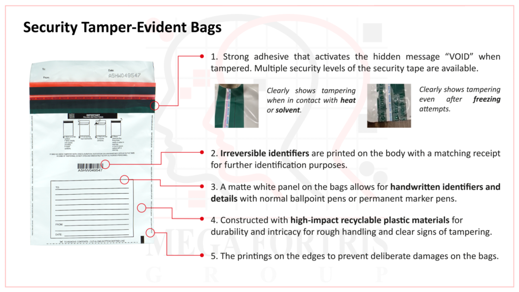 Securing your assets with our Security Tamper-Evident Bags will give you a peace of mind for their strong protection and their prevention against unwanted acts.